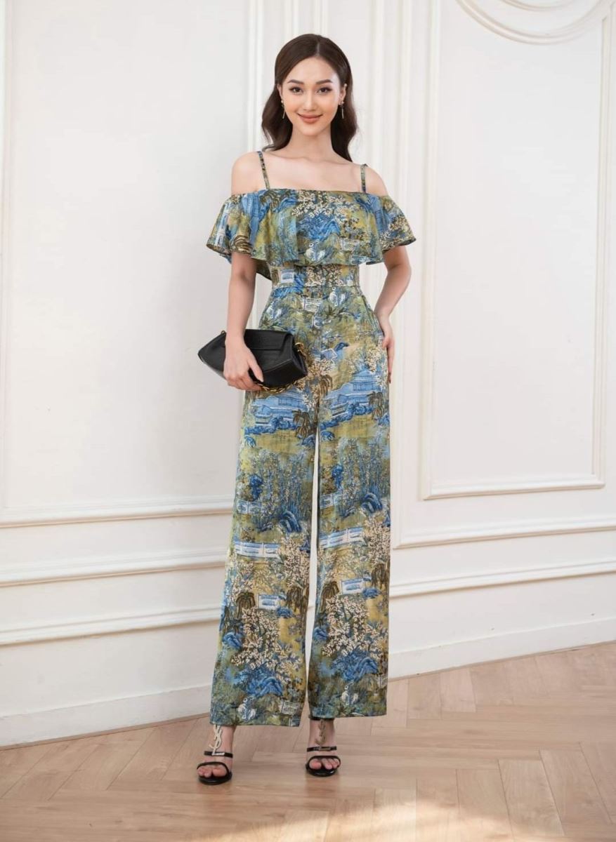 Jumpsuit hai dây quần ống suông rộng họa tiết hoa lá không chỉ tạo cảm giác thoải mái mà còn tôn vóc dáng thanh thoát cho người mặc.