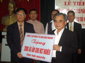 Đại diện lãnh đạo các ban, ngành, đoàn thể, các khu công nghiệp tỉnh, Hội người cao tuổi các huyện đã tới dự buổi lễ. Ông Bùi Ngọc Huyên, Tổng Giám đốc, Chủ tịch Hội đồng quản trị Công ty TNHH một thành viên ô tô Xuân Kiên đã trao số áo trên cho lãnh đạo Hội Người cao tuổi tỉnh Thái Nguyên (ảnh). Tiếp đó, lãnh đạo Công ty, lãnh đạo các khu công nghiệp tỉnh, Hội Người cao tuổi đã trực tiếp đưa 400 áo ấm về tặng Hội Người cao tuổi huyện Võ Nhai và đến tặng áo ấm cho bà Nguyễn Thị Vân ở xóm Cổ Rồng, bà Lê Thị Hoài xóm Làng Lường là 2 người cao tuổi có hoàn cảnh khó khăn của thị trấn Đình Cả.