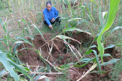 Khác với các gia đình trên, gia đình bà Bùi Thị Chiến và Lê Thị Đoàn ở tổ 1 đang rất lo lắng vì đất canh tác của gia đình bị sụt. Tại thời điểm chúng tôi đến, trong các hố đất, những cây ngô vẫn còn tươi nguyên nằm ngổn ngang. Quan sát xung quang, chúng tôi thấy trên diện tích đất trồng ngô của 2 gia đình này xuất hiện đến chục hố sâu chừng nửa mét, rộng khoảng 2 đến 5 mét vuông. Bà Chiến khẳng định: Từ năm ngoái, khu vực này đã xuất hiện các hố nhưng bề mặt các hố nhỏ. 1 tuần nay, các hố xuất hiện nhiều hơn với đường kính lớn hơn. Bởi vậy, dù ngô còn non nhưng chúng tôi phải thu hoạch dần vì sợ khu vực này sẽ bị sụt lún rộng và sâu hơn.