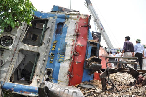 8h30 sáng 6/8, trong lúc cố băng qua đường sắt, một xe ben chở cát đã bị đoàn tàu TN6 chạy từ Nam ra Bắc húc và đẩy đi xa khoảng 50 m.