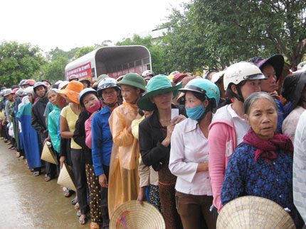 Những người dân ở xã Hưng Trạch có tên trong danh sách được nhận hàng cứu trợ của đoàn Thái Nguyên đã có mặt từ rất sớm. Ai cũng muốn chen lên đứng đầu hàng để mau nhận được hàng cứu trợ. Ông Lưu Công Sơn, Phó Chủ tịch Hội Chữ thập đỏ tỉnh cho biết: Hàng cứu trợ dành cho Quảng Bình ngoài 500 triệu đồng tiền mặt còn có 250 suất quà có tổng trị giá gần 90 triệu đồng, chủ yếu là gạo, mì tôm, chăn ấm, sách vở, bút... Bà Ngô Thị Xuân sau khi nhận được hàng cứu trợ không giấu được xúc động, nói: Tôi ở bên kia dòng sông Bùng, nhà đã bị lũ cuốn rồi, cũng vừa hết cái ăn, may mà có đoàn cứu trợ về... Còn bà Nguyễn Thị Cúc, nhà bên kia sông Son tay ôm thùng mì tôm, miệng trực khóc nói với chúng tôi: Chỗ hàng này 4 người trong gia đình tôi phải chia ra ăn trong 3 ngày... Còn với chị Trần Thị Lý, thôn Khương Hà 2 không chỉ thiệt hại về vật chất, mà còn bị tổn thương rất lớn về tinh thần bởi chị đã mất đi cậu con trai 18 tuổi: Nước lên nhanh quá, vừa thấy ở sân, chỉ nhoáng sau đấy đã thấy ngập lưng nhà. Đang mải lo cho mẹ già 99 tuổi tránh lũ thì thằng Kiếm đã bị lũ cuốn rồi – chị nói trong đau đớn.