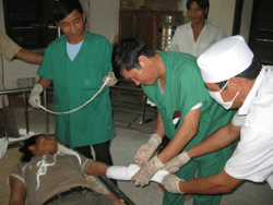 Mỗi tháng khoa B5 thực hiện từ 70-80 ca mổ, tiểu phẫu mổ trong đó có đến 90% là bệnh nhân chấn thương về xương và có trên 100 ca phải dùng các thủ thuật nắm xương. Trao đổi với chúng tôi, Thượng tá Đinh Văn Chấp, Chủ nhiệm khoa B5 cho biết: Với các bệnh về xương, chúng tôi vẫn áp dụng nguyên tắc xử lý vết thương chiến tranh và thấy rất hiệu quả. Theo đó, những vết thương bị nhiễm bẩn sẽ không khâu ngay mà phải xử lý hết nhiễm trùng mới bắt đầu khâu, trong trường hợp vết thương bị gẫy nhiều, nguy cơ nhiễm trùng cao thì sẽ dùng phương pháp đặt cọc ép ngoài. Nếu trường hợp gẫy xương di lệch nhiều thì sẽ tiến hành mổ theo phương pháp mới đóng đinh nội tuỷ có chốt. Phương pháp mới này có ưu việt là không để lại hiện tượng teo cơ, cứng khớp như phương pháp dùng vít trước đây và bệnh nhân có thể đi lại được sau 3 tuần”.