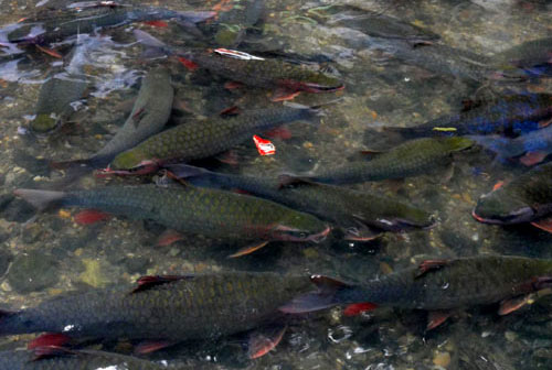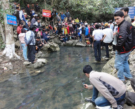 Điều lạ kỳ là, vào ngày 5-5 và 30 Tết, bà con sống trong thôn cho gạo nếp vào thùng mang xuống suối ngâm, cá chỉ bơi lội xung quanh mà không dám ăn. Chỉ những hạt rơi vãi ra ngoài chúng mới ăn.