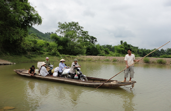 Chúng tôi đến 2 xóm trên vừa lúc nhiều người dân đi chợ phiên về đang tập trung ở bến đò để sang sông. Đò nhỏ, người và hàng nhiều nên chủ đò phải hướng dẫn mọi người phân chia thành từng nhóm để chuyển dần qua sông. Giữa cái nắng hè gay gắt, nhìn con đò không có bất kỳ một phương tiện cứu hộ nào chòng chành vượt sông khi phải oằn mình “cõng” hàng chục người kèm theo hàng hóa khiến tôi chợt rùng mình khi nghĩ đến những tai nạn thảm khốc từ các chuyến đò ngang đầy bất trắc như thế. Anh Đặng Quốc Đạt, cán bộ nông nghiệp UBND xã Hòa Bình với vai trò là người dẫn đường cho chúng tôi biết: Xóm Tân Yên và Đồng Vung không những bị chia cắt về giao thông mà còn thường xuyên phải đối mặt với khó khăn về phát triển kinh tế. Bà con ở đây chủ yếu sống bằng nghề nông nghiệp, thế nhưng việc tiêu thụ các sản phẩm nông sản lại rất khó. Nếu muốn đem hàng hóa ra chợ trung tâm thì chỉ có cách duy nhất là chất tất cả các sản phẩm lên con đò già nua, mỏng mảnh và phó thác sự an nguy cho người cầm sào. Trong suốt hàng chục năm qua, những người lái đò ở đây đã không thể nhớ hết số lần mình phải lặn ngụp giữa những con nước lớn để cùng bà con vớt các sản phẩm không may bị rơi xuống lòng sông.