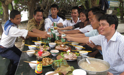 Nhà không có đàn bà. Cánh lính đảo nói vui với nhau như thế. Vậy là cùng vào bếp, mỗi người một tay, nhặt rau, vo gạo và trổ tài chế biến món ăn ngày Tết. Trên các đảo, không khí chuẩn bị của từng phân đội chợt trở lên tưng bừng, hào hứng bởi tiếng cười, tiếng nói của cán bộ, chiến sĩ (CBCS).
