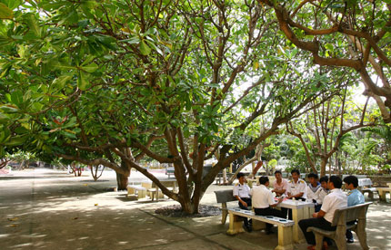 Việc phủ xanh đảo Trường Sa rất quan trọng bởi nắng ở đây rất gắt gao, gió mang hơi muối mặn lúc nào cũng chen khắp mọi ngõ ngách, chỉ cần đứng ở chỗ có gió thổi liên tục khoảng 10 phút, tóc của bạn sẽ trở nên xơ cứng vì bám đầy nước muối. Chính vì thế, việc trồng cây phủ xanh đảo rất quan trọng, cây xanh sẽ giúp che nắng, ngăn gió, có bóng mát mới trồng được rau, chăn nuôi lợn, gà để cải thiện bữa ăn. Trong 2 ngày ở lại đảo, khi đi tham quan các nơi, tôi nhận thấy khắp vùng đảo có nhiều cây có tên gọi là cây Tra, đây là loại cây thân cứng, lá to dầy và có hình gần như hình lục lăng, tán cây rộng, cây to có thể cao tới 4 đến 5 mét. Do có tán lá rộng nên cây Tra giúp che bóng mát, ngăn được gió, tuy tán to nhưng thân cây không lớn lắm, chủ yếu là các cành cây vươn dài vì thế không bị cản tầm nhìn, đây hiện là cây xanh phổ biến nhất ở trên đảo.