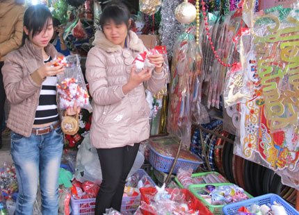 Tại các cửa hàng, lượng người đi mua đồ trang trí, quà tặng Giáng sinh đã bắt đầu tấp nập. Một số nơi phải tuyển thêm nhân viên để phục vụ bán hàng. Hàng hóa trong dịp Noel năm nay khá đa dạng về mẫu mã, chủng loại nên người mua được thỏa sức lựa chọn. Mặt hàng bán chạy nhất trong thời gian này vẫn là cây thông Noel với các màu xanh, trắng, chiều cao từ 0,5-3,5m, giá dao động từ 200 nghìn đồng đến 3 triệu đồng/cây (cây thông đã trang trí hoàn chỉnh giá từ 500 nghìn đồng đến 5 triệu đồng/cây). Các đồ trang trí cây thông cũng bán khá “chạy”: 1 dây kim tuyến có giá từ 5-50 nghìn đồng, 1 vòng thiên thần có giá từ 50-400 nghìn đồng (tùy theo kích cỡ); quần áo ông già Noel giá giao động từ 30-600 nghìn đồng/bộ (tuỳ theo kích cỡ, chất liệu vải). Một số mặt hàng trong nước sản xuất với mẫu mã, chất lượng tốt cũng được khách hàng ưa chuộng, như tấm thiệp chúc mừng dựng hình, thiệp phát nhạc… có giá từ 5-30 nghìn đồng/chiếc. Ngoài ra, các sản phẩm như thú nhồi bông, gang tay, bít tất, đồ chơi… cũng được nhiều người dùng làm quà tặng cho người thân yêu của mình trong dịp Giáng sinh…