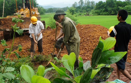 Ông Nga hồ hởi cho biết: Mở đường là điều cần thiết để việc đi lại được thuận lợi hơn trước, tránh khỏi cảnh lầy lội, trơn trượt mỗi khi trời mưa, nên gia đình tôi rất hoan nghênh. Ý kiến của ông Nga cũng là ý kiến của hơn 89 hộ dân với 357 nhân khẩu của xóm. Người dân nơi đây đời sống còn nhiều khó khăn nhưng đã hiến đến trên 3.000 m2 đất 100 nghìn đồng/nhân khẩu cùng ngày công lao động để san lấp nền đường. Ông Ngô Thanh Phúc, Bí thư Chi bộ xóm La Chưỡng cho biết: xóm được đảng ủy - UBND xã chọn làm điểm tuyến đường trục chính trong xóm gần 1 km theo đúng tiêu chí nông thôn mới, đó là mặt đường rộng tối thiểu 4,5 đến 5m, hai bên có rãnh thoát nước. Chúng tôi đã tích cực tuyên truyền vận động bà con nhân dân, nhất là 28 hộ có đất vười đồi và đất ruộng nằm dọc 2 bên tuyến đường, kịp thời khen thưởng, biểu dương những gia đình tiên phong hiến đât, góp tiền. Nên chỉ sau 1 tháng, 28 hộ gia đình này đã đồng ý hiến đất và người dân trong xóm cũng vui vẻ đóng góp đủ số tiền 35,7 triệu đồng để thuê máy xúc, máy ủi làm nền đường.