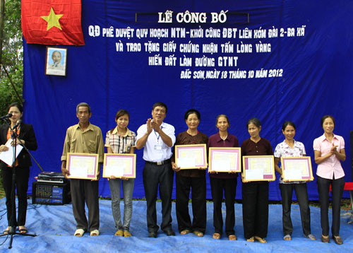 Tại buổi Lễ, chính quyền địa phương và bà con nhân dân đã khởi công xây dựng tuyến đường liên xóm Đài 2 - Ba Xã với chiều dài 550m, mặt đường rộng 3,5m, dày 0,16m và trao Giấy chứng nhận tấm lòng vàng hiến đất làm đường cho 7 hộ dân thuộc 2 xóm trên (ảnh).