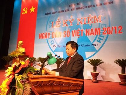 Phát biểu tại buổi lễ, TS Dương Quốc Trọng - Tổng Cục trưởng Tổng cục Dân số - Kế hoạch hoá gia đình cho biết, năm 2012 là năm đầu tiên triển khai thực hiện Chiến lược DS-SKSS Việt Nam giai đoạn 2011-2020 và Chương trình Mục tiêu Quốc gia DS-KHHGĐ giai đoạn 2012-2015, công tác DS-KHHGĐ nước ta đứng trước nhiều thách thức khó khăn. Theo quan niệm dân gian, năm Nhâm Thìn được coi là “năm đẹp”; Tỷ suất giới tính khi sinh (TSGTKS) tiếp tục tăng cao; Mức sinh còn khác biệt giữa các vùng miền, tỉnh thành; Tốc độ di cư và đô thị hoá nhanh khiến cho việc cung cấp dịch vụ KHHGĐ cho người di cư còn nhiều khó khăn…