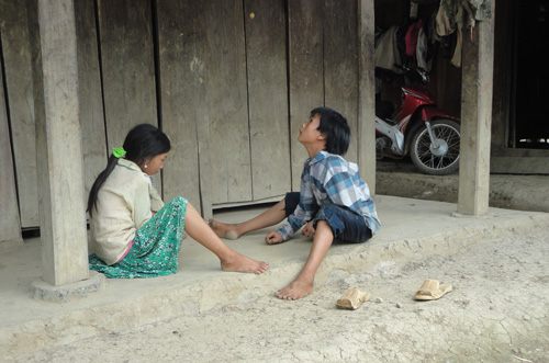 Một ngày đầu tháng 6, chúng tôi men theo con đường nhỏ gập ghềnh để đến với bà con xóm Mỏ Nước. Ghé vào ngôi nhà nhỏ làm bằng gỗ ở ngay đầu xóm để hỏi thăm, chị Lầu Thị Mai (chủ nhà), sinh năm 1990, vừa rót nước mời vừa hỏi han chúng tôi. Khi biết chúng tôi muốn tìm hiểu về chuyện sinh đẻ của bà con nơi đây, chị Mai cho biết: Bà con chỉ đẻ ở nhà thôi, nếu đau đẻ 1 ngày, 1 đêm mà đứa bé không chui ra mới phải đi bệnh viện. Rồi chị chỉ 2 đứa con nhỏ trạc 2 - 4 tuổi đang chơi ở góc nhà nói: Hai đứa này mình cũng đẻ ở nhà đấy.