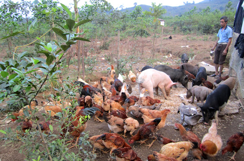 Theo con đường mòn chỉ vừa một lối đi, vắt qua suối Cái, ngược đèo Vòi Voi, chúng tôi lên trang trại của cha con ông Hợi. Trước mắt chúng tôi, trên vùng đất rộng 6ha, trên 2.000 cây lim xanh (trồng khoán cho Vườn quốc gia Tam Đảo) đã mọc cao quá đầu người, những khoảng đất trống còn lại được trồng xen cây màu ngắn ngày như: khoai, sắn, đậu tương. Đàn vật nuôi trong trang trại của ông Hợi có nhiều loại, như: lợn rừng, dê, trâu, bò, gà ta và năm nay mới có thêm cá vì đào được ao.