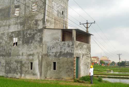 Theo thống kê, hiện nay, trên địa bàn huyện Phú Bình có 81 trường hợp vi phạm HLATLĐ, chủ yếu là do xây dựng nhà ở, công trình phụ nằm trong phạm vi bảo vệ của hành lang lưới điện. Cùng các đồng chí cán bộ kỹ thuật của Điện lực Phú Bình đi khảo sát một số điểm vi phạm HLATLĐ điển hình trên địa bàn huyện, chúng tôi không khỏi “rùng mình” khi chứng kiến cảnh những ngôi nhà chỉ cách đường dây điện cao thế vài chục cm. Thậm chí có gia đình nhà tắm, công trình phụ chỉ cách đường dây điện cao thế khoảng 20cm. Điển hình trong số các trường hợp vi phạm HLATLĐ trên địa bàn huyện có thể kể đến trường hợp của gia đình ông Dương Minh Thặng, tổ dân phố Đông, thị trấn Hương Sơn. Năm 2011, gia đình ông làm thủ tục chuyển đổi 50m2 từ đất nông nghiệp sang đất thổ cư để xây dựng nhà ở nhưng gia đình ông lại xây dựng nhà ở trên diện tích hơn 80m2. Chính vì vậy, sau khi xây dựng xong, ngôi nhà 2 tầng của gia đình ông Thặng đã nằm trong phạm vi bảo vệ của đường điện cao thế 10kV, lộ 971. Cụ thể, phần mái của ngôi nhà chỉ cách đường dây điện cao thế khoảng 40cm. Ngay sát ngôi nhà của ông Thặng là ngôi nhà của gia đình ông Dương Văn Tiến, phần mái của ngôi nhà này cũng chỉ cách đường dây điện cao thế khoảng 50cm.