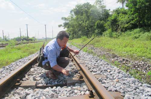 Vừa đặt chân lên mặt đường ray, cái nắng oi ả sau trận mưa hôm trước hầm hập hắt lên như thiêu đốt. Trước khi đi anh Hùng dặn tôi: Chú ý nhé, bước không quen rất dễ vấp ngã. Cái nắng nóng càng lúc càng thêm gay gắt, mồ hôi vã ra như tắm. Đi phía trước, anh Hùng, chốc chốc lại cúi xuống siết lại con ốc long hay kiểm tra thanh tà vẹt bị xê dịch khỏi vị trí. Dưới ánh mặt trời chói chang, khuôn mặt anh đỏ bừng, những giọt mồ hôi rơi theo từng vòng xoay của con ốc. Có lẽ do quanh năm suốt tháng phải “dầm” mình dưới trời mưa, nắng, nên nhìn anh già dặn hơn tuổi (anh sinh năm 1971). Tôi nhẩm tính, ngày nào cũng đi bộ 14km, trong 10 năm làm nghề, anh Hùng đã đi tổng cộng khoảng 37 nghìn km.