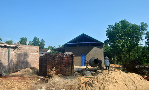 Không chỉ ở xóm Hắng mà 3 xóm còn lại là Cống Thượng, Liên Sơn và Liên Minh cũng đều có tình trạng người dân xây dựng đón đền bù. Tại xóm Liên Sơn, người dân đã tranh thủ xây thêm chuồng trại, bờ rào, chồng thêm tầng nhà, cơi nới sân... Đến nay, cơ bản các công trình đã hoàn thiện. Theo thống kê sơ bộ của xã, có khoảng trên 50 hộ xây dựng, cơi nới các công trình. Tại thời điểm chúng tôi đi khảo sát (ngày 27-8), nhà tạm và các công trình phụ trợ của nhiều hộ vẫn đang được hoàn thiện. Hầu hết các công trình đều được xây với gạch không nung hoặc gạch đỏ loại 2, loại 3, lượng xi măng hạn chế và trát tạm bợ.