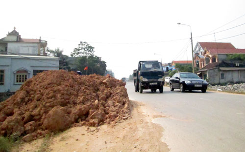 Đi dọc tuyến Quốc lộ 3 cũ (đoạn qua địa bàn các xã Tân Hương và Nam Tiến, huyện Phổ Yên) vào sáng 4-10, chúng tôi thấy hơn 20 điểm có đất đổ thải tràn ra mép đường. Trong đó, tại khu vực cổng Công ty cổ phần Hà Anh, ở xóm Trại, xã Nam Tiến, có hàng chục đống đất lấn chiếm hành lang ATGT. Vì vướng các đống đất nên các phương tiện giao thông đi qua đây đều phải giảm tốc độ, đặc biệt gặp trường hợp hai xe tải lớn đi ngược chiều là đoạn đường này lại bị ách tắc cục bộ. Ông Lâm Văn Thất, người dân sống tại khu vực này cho biết: Những đống đất này bị đổ tràn lan ra đường gây mất ATGT và bụi bặm. Mấy hôm trước, vào buổi tối, có người đi qua đây do đâm vào đống đất nên đã bị ngã ra đường, may là chỉ bị xây xát nhẹ.