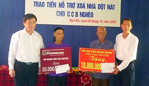 Cựu chiến binh Lưu Chí Mỳ từng tham gia chiến đấu 13 năm trong cuộc kháng chiến chống Mỹ cứu nước. Hiện tại, gia đình ông là hộ nghèo, vợ chồng ông đã già yếu lại phải nuôi con gái bệnh tật. Nhiều năm nay, gia đình ông phải sống trong ngôi nhà tạm, dột nát và đã xuống cấp nghiêm trọng. Trước hoàn cảnh khó khăn đó, Hội Cựu chiến binh Khối Doanh nghiệp tỉnh đã hỗ trợ 10 triệu đồng, Hội cựu chiến binh Ngân hàng Nông nghiệp và PTNT Chi nhánh Thái Nguyên hỗ trợ 10 triệu đồng để gia đình ông xây dựng ngôi nhà mới.