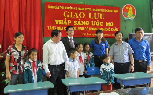 Tại buổi giao lưu, đại diện Tỉnh Đoàn và Chi nhánh Viettel Thái Nguyên đã tặng 01 bộ trống đội cho Liên đội trường Tiểu học Đồng Thịnh; 05 suất quà là bàn, ghế học sinh cho 05 em có hoàn cảnh đặc biệt khó khăn của Nhà trường (ảnh). Cùng với đó, các tân sinh viên tham gia đoàn đã giao lưu văn nghệ, tặng quà cho nhiều học sinh khác của nhà trường…