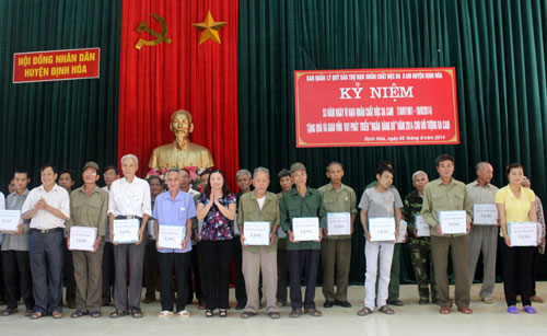 Ngày 5-8, Hội nạn nhân chất độc da cam Định Hóa phối hợp với Hội Chữ thập đỏ huyện tổ chức kỷ niệm 53 năm Ngày Vì nạn nhân chất độc da cam Việt Nam (10/8/1961 - 10/8/2014); tặng quà, giao vốn phát triển "Ngân hàng bò" cho đối tượng da cam trên địa bàn huyện.