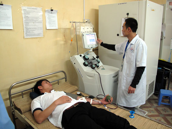 Sau khi làm các xét nghiệm theo quy trình, 3 sinh viên được đưa sang phòng thu gom tiểu cầu. Tại đây chúng tôi gặp anh Hoàng Đình Luận, chồng bệnh nhân Dương Thị Tươi, ở xóm Phúc Hòa, xã Thịnh Đức T.P Thái Nguyên đang đứng ngồi không yên. Nhìn thấy các sinh viên đến, anh Luận vui mừng bảo: “Vợ tôi phát hiện mắc phải căn bệnh ung thư máu quái ác cách đây 4 tháng. Sau khi điều trị ở Viện Huyết học Truyền máu TW gần 2 tháng sức khỏe của vợ tôi hồi phục dần. Sau khi ra xuất viện được khoảng hơn 10 ngày thì vợ tôi lại bị sốt cao, từ hôm nhập viện Đa khoa TW Thái Nguyên đến nay gần 20 ngày đã phải truyền 3 lần tiểu cầu. Trong khi đó lượng tiểu cầu dự trữ của viện đã hết. Các bác sĩ bảo có nhóm sinh viên chuyên hiến tiểu cầu tình nguyện và liên hệ.