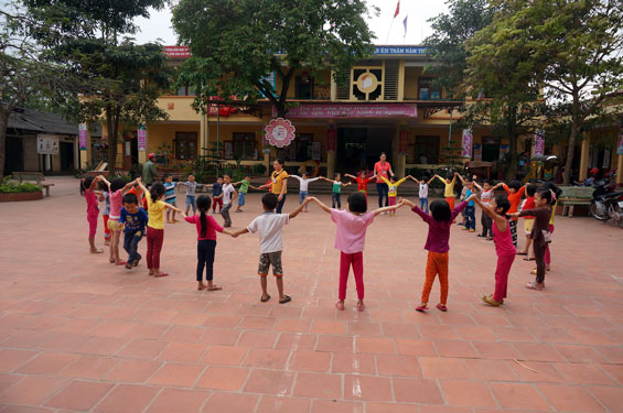 Chúng tôi đến Trường Mầm non Hương Sơn để tìm hiểu thêm về công tác chăm sóc, giáo dục trẻ em ở đây. Dạo một vòng quanh sân trường và các lớp học, chúng tôi cảm nhận được đây là một môi trường thân thiện cho các cháu học tập và vui chơi. Bằng sự sáng tạo của mình, các cô giáo đã trang trí nhiều góc hoạt động trong lớp và ngoài trời với những hình ảnh sinh động, ngộ nghĩnh để thu hút sự tập trung của trẻ. Các bài đồng dao dễ nhớ, dễ thuộc hay những trò chơi dân gian thú vị cũng được nhà trường chú trọng đưa vào giảng dạy nhằm giúp các bé phát triển trí tuệ, thể lực và có một tâm hồn trong sáng. Cô Đồng Thị Dung, Hiệu trưởng trường Mầm non Hương Sơn cho biết: Nhà trường đón chuẩn Quốc gia từ năm 2011, hiện tại, trường có gần 700 cháu theo học tại 6 lớp nhà trẻ và 15 lớp mẫu giáo. Để trẻ phát triển toàn diện, nhà trường đã tranh thủ các nguồn lực để đầu tư cơ sở vật chất, đồng thời tích cực đổi mới các phương pháp giảng dạy sao cho phù hợp với từng độ tuổi của các cháu. Đặc biệt, các hoạt động ngoại khóa như tổ chức cho các cháu đi thăm quan di tích lịch sử, danh lam thắng cảnh trong và ngoài tỉnh cũng được nhà trường thường xuyên thực hiện, điều này vừa giúp trẻ mở rộng vốn hiểu biết về thế giới xung quanh vừa hình thành cho trẻ lòng tự hào dân tộc, giáo dục trẻ chăm ngoan và biết yêu quê hương, đất nước.