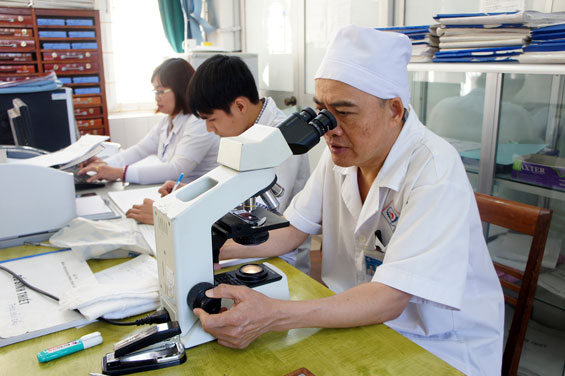 Theo bác sĩ Thông, chẩn đoán giải phẫu bệnh là công tác dựa trên việc xem xét các mẫu bệnh phẩm đã được cố định trong formol, chuyển đúc trong nến, cắt thành các lát cắt rất mỏng và nhuộm màu bằng hóa chất với nhiều phương pháp khác nhau. Nói thì đơn giản nhưng chúng tôi mất từ 1 đến 2 ngày để hoàn thành một kết quả giải phẫu bệnh tùy thuộc vào tính chất của bệnh phẩm. Có những bệnh phẩm nhỏ nhưng cũng có bệnh phẩm nặng hàng kg hoặc rất cứng như xương… Trung bình, mỗi ngày, Khoa Giải phẫu bệnh thực hiện được khoảng 50 mẫu bệnh phẩm giải phẫu bệnh cho các khoa trong Bệnh viện và một số cơ sở khám, chữa bệnh khác trên địa bàn. Trong đó, nhiều nhất là những mẫu bệnh phẩm ung bướu.