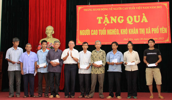 Nhân kỷ niệm 24 năm Ngày Quốc tế Người cao tuổi (1/10/1991-1/10/2015) và Tháng hành động vì Người cao tuổi (NCT) năm 2015, ngày 30-9, Ban Đại diện Hội NCT T.X Phổ Yên đã phối hợp với Công ty TNHH Tư vấn, Đầu tư và Phát triển Đông Nam Á, Công ty cổ phần Dược và Thiết bị y tế Hà Tuyên tổ chức chương trình tặng quà NCT nghèo, có hoàn cảnh khó khăn.