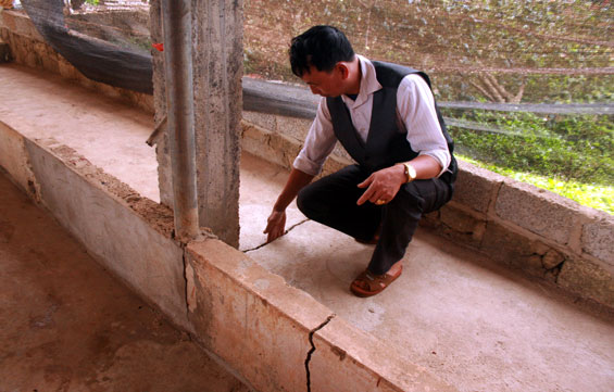 Ngay khi nhận được phản ánh của người dân, chúng tôi đã có mặt tại tổ 14, thị trấn Trại Cau. Gia đình đầu tiên chúng tôi đến là nhà ông Vũ Tất Minh, hộ có chuồng trại chăn nuôi quy mô 60-70 con lợn thịt/lứa và ao thả cá trước cửa nhà. Gặp chúng tôi, ông Minh không mời nước mà kéo ngay đến khu nuôi lợn và chỉ cho xem những vết nứt tường, nền chuồng còn mới nguyên. Ông còn nghiêng bàn tay thò hẳn vào trong khe nứt để chứng minh cho mọi người thấy. Dẫn chúng tôi ra sau vườn, ông Minh dỡ tung tấm vải bạt che hàng rào mới đổ và chỉ một số đoạn nứt chạy dài hàng mét trên bờ tường còn sót lại. Ông Minh cũng cho biết, mấy ngày gần đây hầm khí biogas phía sau chuồng lợn thấy bốc mùi hôi thối nên đoán là bể khí đã bị kéo nứt do hiện tượng sụt lún. Khi tới ao nuôi cá, chúng tôi thấy nước cạn gần hết, phơi lưng mấy con cá trê lai.