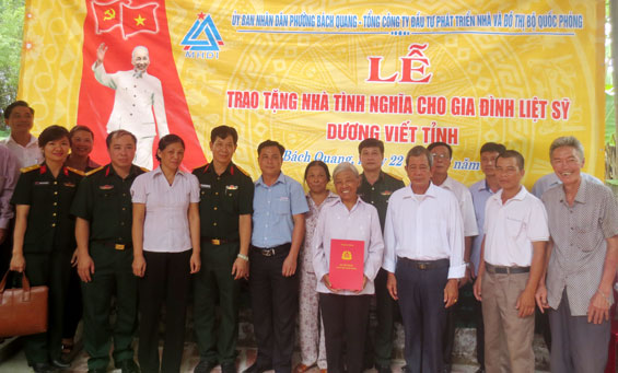 * Cũng trong ngày 22-7, Tổng Công ty Đầu tư phát triển nhà và đô thị Bộ Quốc phòng đã phối hợp với UBND phường Bách Quang (T.P Sông Công) tổ chức khánh thành, bàn giao nhà tình nghĩa tặng gia đình bà Dương Thị Phong, ở tổ dân phố La Đình, là vợ liệt sĩ Dương Viết Tỉnh (hy sinh trong thời kỳ kháng chiến chống Mỹ cứu nước). Ngôi nhà có diện tích sử dụng 40m2, kinh phí xây dựng trên 80 triệu đồng (trong đó Tổng Công ty Đầu tư phát triển nhà và đô thị Bộ Quốc phòng hỗ trợ 75 triệu đồng, còn lại được Hội Chữ thập đỏ T.P Sông Công ủng hộ). Nhân dịp này, các tổ chức đoàn thể ở địa phương đã tặng nhiều phần quà cho gia đình bà Phong.