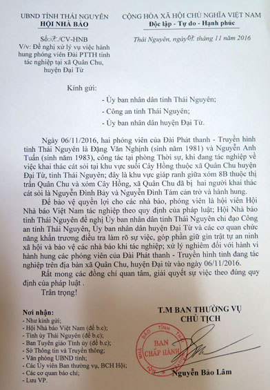 Cũng trong ngày 7-11, Hội Nhà báo tỉnh đã có Công văn số 57/CV-HNB gửi UBND tỉnh, Công an tỉnh, UBND huyện Đại Từ với nội dung đề nghị xử lý vụ việc hành hung phóng viên Đài Phát thanh và Truyền hình tỉnh. Chúng tôi sẽ tiếp tục thông tin đến bạn đọc về vụ việc này khi có kết luận của cơ quan chức năng.