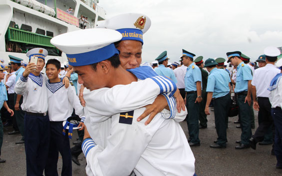 Trong buổi tiễn đưa đoàn công tác ra Trường Sa, người đi, người ở lại quyến luyến: vợ tiễn chồng, con tiễn cha, người yêu tiễn người yêu, bạn tiễn bạn... trong mắt họ, dù có chút buồn thoáng qua nhưng đọng lại vẫn ngập tràn ánh lửa niềm tin. Giữa hàng nghìn người ấy, chúng tôi bắt gặp hình ảnh Trung úy Lê Bá Tùng, Lữ đoàn 146 Hải Quân đang quyến luyến chia tay người vợ trẻ là chị Văn Thị Nhung đang mang bầu tháng thứ 6. Đây là lần thứ 3 chị Nhung tiễn chồng ra đảo. Giờ phút chia tay, chị Nhung nghẹn ngào: “Mẹ con em chúc anh đi bình yên trở về. Đêm giao thừa nhớ gọi điện về cho mẹ con nhé”, rồi chị nép vào vai anh giấu đi giọt nước mắt tràn mi. Khi tiếng còi tàu 561 hú vang ba hồi rời cảng, chị mới chịu buông tay chồng rồi ngoảnh mặt bật khóc. “Mỗi lần tiễn chồng đi biển, em cảm thấy mình hụt hẫng. Thêm một lần nữa em phải đón Tết một mình ở đất liền. Mặc dù rất thiệt thòi, song em cảm thấy tự hào vì có chồng là lính Trường Sa”... Chị Nhung lau nước mắt nhìn con tàu xa dần trong những con sóng biển.