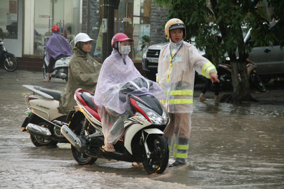 Cảnh sát giao thông hướng dẫn người dân không đi vào khu vực ngập úng.