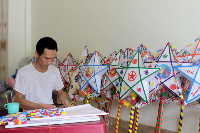 Thái Nguyên không phải là nơi có những làng nghề truyền thống làm đèn ông sao hay các đồ chơi truyền thống như ở Báo Đáp (Nam Định) hay Hưng Yên, Hà Nội... Song đây đó vẫn có người vẫn làm được loại đồ chơi này để đáp ứng nhu cầu của con trẻ trong vùng vào mỗi dịp Tết Trung thu. Chúng tôi đã tìm đến gia đình anh Đào Xuân Loan ở xóm Trường, thị trấn Chợ Chu (Định Hóa). Trong nhà anh đang bày la liệt những chiếc đèn ông sao, cái thì đang làm dang dở, cái đã hoàn chỉnh. Khác với những chiếc đèn truyền thống mà tôi đã nhìn thấy được dán bằng giấy bóng kính đỏ, viền xanh, tua rua vàng thì những chiếc đèn của anh Loan được làm hoàn toàn bằng giấy trắng. Điểm xuyết trên 5 cánh là các hoa văn, hình chữ “Vui Trung thu nhớ Bác” được cắt dán khéo léo. Ở giữa lồng đèn là những hình ảnh: chị Hằng Nga trong bộ cánh mềm mại; chú Cuội thổi sáo bên gốc đa; khóm tre, khóm trúc soi gương dưới ánh trăng rằm; hình ảnh Bác Hồ cười tươi nhìn các cháu vui Tết Trung thu…Xung quanh đèn và cán cầm tay được trang trí những hình tua rua xanh, đỏ, tím, vàng làm cho chiếc đèn càng thêm rực rỡ. Anh Loan cho biết: “Để làm được một chiếc đèn ông sao như vậy không hề đơn giản. Bởi các công đoạn làm đèn hoàn toàn bằng thủ công và rất công phu, kỹ lưỡng từ khâu chọn vật liệu đến cắt dán, trang trí. Không những vậy, mỗi chiếc đèn làm ra không chỉ kết tinh mồ hôi công sức mà đòi hỏi phải có đôi tay khéo léo, tâm hồn yêu trẻ và làm bằng cả cái tâm của mình”. Chính sự công phu, tỉ mẩn nên một ngày anh chỉ làm được 3 đến 4 khung đèn hoặc 2 chiếc đèn hoàn chỉnh. Để đáp ứng nhu cầu của khách đặt hàng và bán vào những ngày Tết Trung thu anh phải chuẩn bị vật liệu và làm đèn từ cách đây hai tháng. Đèn được làm chắc chắn, có thể dùng nhiều năm nên giá dao động từ 50.000 đến 70.000 đồng..