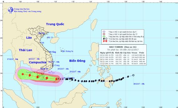 Theo Trung tâm Dự báo Khí tượng Thuỷ văn Trung ương, hồi 4 giờ ngày 25/12, vị trí tâm bão số 16 ở vào khoảng 8,3 độ Vĩ Bắc; 110,3 độ Kinh Đông, ngay trên khu vực đảo Huyền Trân ( thuộc địa phận tỉnh Bà Rịa-Vũng Tàu) cách Côn Đảo khoảng 410km về phía Đông.