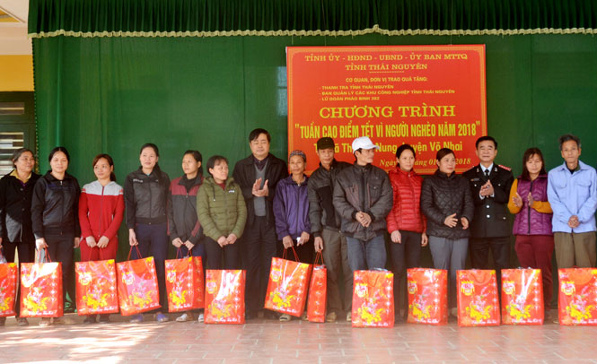 Đồng chí Nguyễn Xuân Trường, Ủy viên Ban Thường vụ, Trưởng Ban Nội chính Tỉnh ủy và lãnh đạo huyện Võ Nhai tặng quà cho các hộ nghèo xã Nghinh Tường (Võ Nhai).