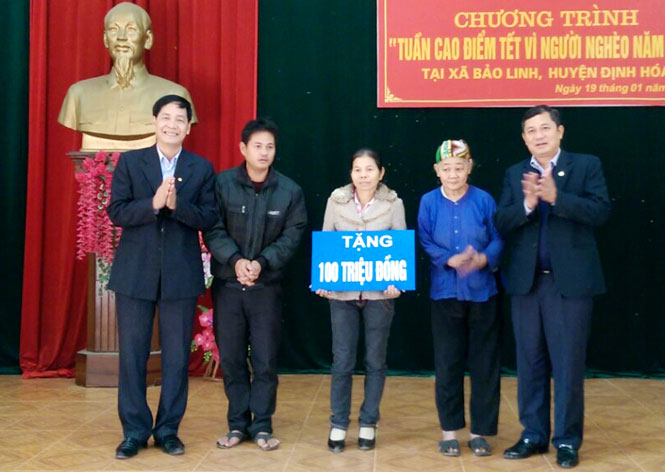 * Tại xã Bảo Linh (Định Hóa), đồng chí Phạm Thái Hanh, Ủy viên Ban Thường vụ Tỉnh ủy, Giám đốc Sở Văn hóa, Thể thao và Du lịch đã trực tiếp trao tiền hỗ trợ làm nhà cho 3 gia đình có hoàn cảnh khó khăn trên địa bàn gồm: Bà Nguyễn Thị Chân, xóm Bảo Biên 1; ông Trần Văn Trình, bản Phù và gia đình bà Nông Thị Luyến, xóm Lải Tràn. Tổng trị giá hỗ trợ là 100 triệu đồng. Đây là số tiền được Sở Văn hóa, Thể thao và Du lịch vận động ủng hộ từ cán bộ, công chức của đơn vị. Bà Nông Thị Luyến, thay mặt các gia đình nói trong niềm xúc động: Chúng tôi rất vui khi nhận được sự giúp đỡ của các cấp, ngành trong tỉnh. Từ số tiền hỗ trợ và tự dành dụm được, tôi sẽ nhờ thêm họ hàng để xây ngay một căn nhà mới. Có thể Tết này gia đình vẫn phải ở nhà tạm vì chưa kịp xong nhưng ai cũng vui. Có nhà vững chãi rồi, chúng tôi sẽ yên tâm, tập trung vào lao động sản xuất.
