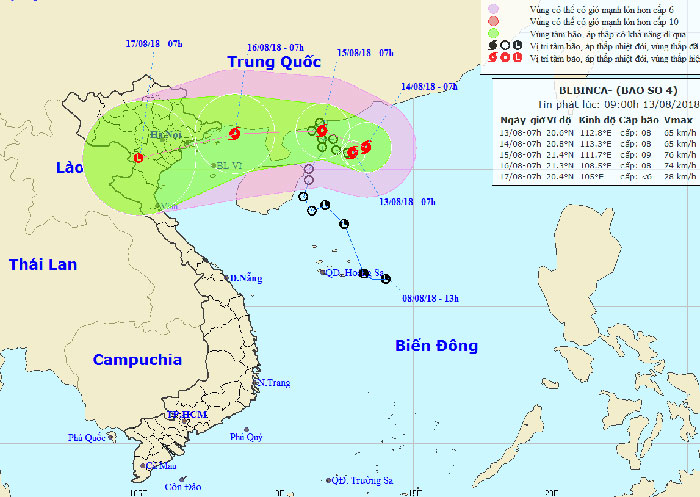 Sáng nay (13-8), theo Trung tâm Dự báo khí tượng thủy văn quốc gia, áp thấp nhiệt đới trên vùng biển phía Nam tỉnh Quảng Đông (Trung Quốc) đã mạnh lên thành bão, cơn bão số 4 năm 2018 (tên quốc tế: Bebinca).
