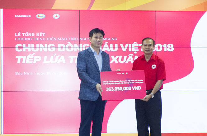 Chương trình Hiến máu tình nguyện chung dòng máu Việt năm 2018 với chủ đề “Tiếp lửa thanh xuân” được phát động tổ chức tại tất cả các cơ sở của Samsung Việt Nam, trọng tâm là 2 nhà máy SEV và SEVT (Samsung Electronics Việt Nam Thái Nguyên). Chương trình do Samsung phối hợp với Viện Huyết học và Truyền máu Trung ương, Ban Chỉ đạo vận động hiến máu tình nguyện các tỉnh Thái Nguyên, Bắc Ninh thực hiện.