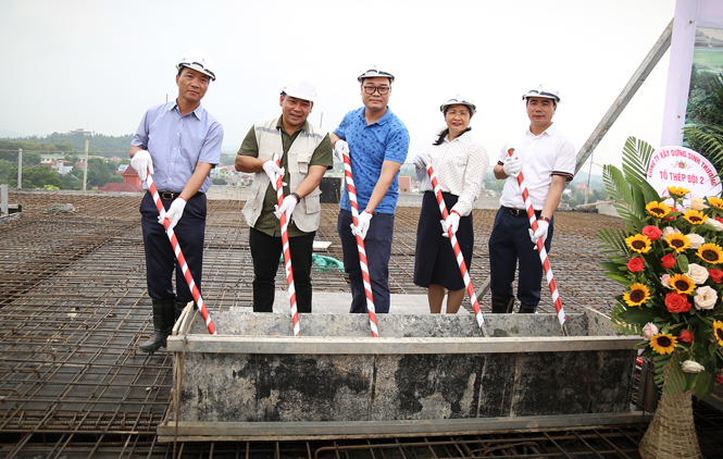 Lãnh đạo Công ty Cổ phần Thương mại Thái Hưng tại lễ cất nóc Trường Iris School (ngày 25-4-2019).