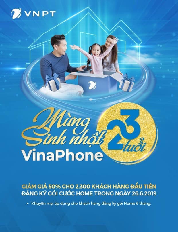 Đặc biệt trong ngày sinh nhật, VNPT VinaPhone giảm giá ngay 50% giá gói thời hạn 6 tháng cho 2.300 khách hàng đầu tiên đăng ký bất kỳ gói Home Combo trên website [https://vnpt.com.vn/goi-home trong ngày 26/06/2019.