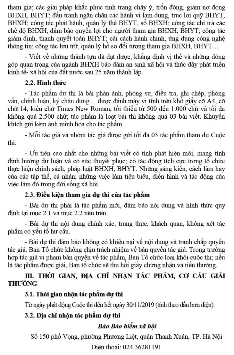 Các tác phẩm dự thi gửi về: Báo Bảo hiểm xã hội, sô 150 phổ Vọng, phường Phương Liệt, quận Thanh Xuân, thành phố Hà Nội - Điện thoại: 024.36281191 (Ngoài bì thư ghi rố: Tác phẩm tham dự Cuộc thi "Viết về bảo hiểm xã hội, bảo hiểm y tế", ngày nhận tác phẩm được tính theo dấu Bưu điện).