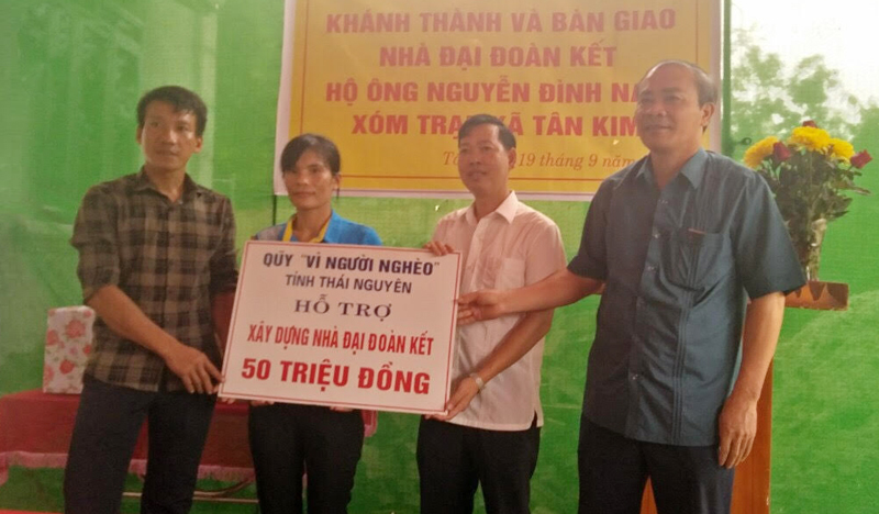 Gia đình anh Nguyễn Đình Nam là hộ nghèo nhiều năm của xã. Cả gia đình có 5 nhân khẩu từ lâu phải sống trong căn nhà cấp 4 xuống cấp nghiêm trọng. Trước hoàn cảnh khó khăn đó, Ủy ban MTTQ tỉnh đã hỗ trợ gia đình anh Nam 50 triệu đồng, cùng với sự giúp đỡ ngày công của bà con hàng xóm, vay mượn ngân hàng và anh em bạn bè, sau hơn 4 tháng thi công, ngôi nhà có diện tích 100 m2, mái lợp tôn lạnh đã được hoàn thành và đưa vào sử dụng. Tổng kinh phí xây dựng ngôi nhà là 250 triệu đồng.