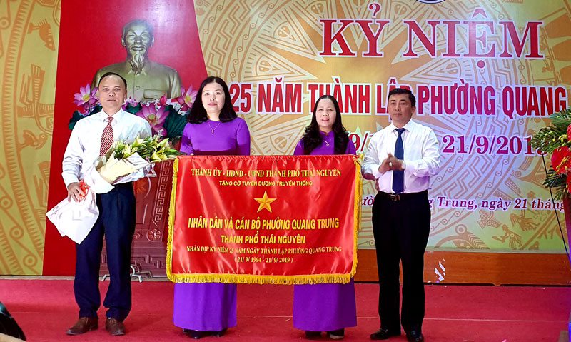 Ghi nhận những thành tích đã đạt được, nhân dịp này, Thành ủy, HĐND, UBND T.P Thái Nguyên đã tặng Cờ tuyên dương truyền thống cho nhân dân và cán bộ phường Quang Trung (ảnh).