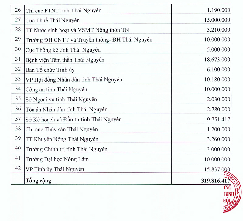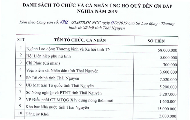Thực hiện Kế hoạch 84/KH-BQL, ngày 28/6/2019 của Ban Quản lý Quỹ Đền ơn đáp nghĩa tỉnh Thái Nguyên vận động xây dựng Quỹ Đên ơn đáp nghĩa tỉnh Thái Nguyên năm 2019, cao điểm từ ngày 01/7/2019 đến ngày 15/8/2019. Tính đến ngày 15/9/2019, Thường trực Ban quản lý Quỹ Đền ơn đáp nghĩa cấp tỉnh đã nhận được sự ủng hộ của các cá nhân, tập thể đang công tác tại các cơ quan nhà nước, đơn vị sự nghiệp, tổ chức chính trị, tổ chức Chính trị - Xã hội... với số tiền ủng hộ là 319.816.000 đồng.