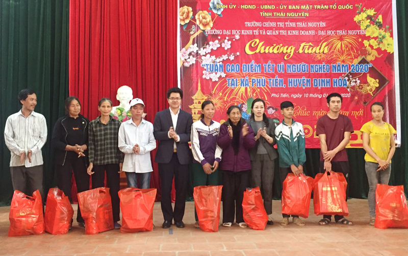 * Tại xã Phú Tiến (Định Hóa), Trường Chính trị tỉnh phối hợp với Trường Đại học Kinh tế và Quản trị kinh doanh - Đại học Thái Nguyên đã trao 243 suất quà Tết cho hộ nghèo và cận nghèo trên địa bàn xã với tổng giá trị quà tặng 69 triệu đồng (ảnh).