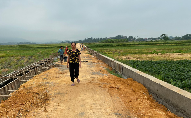 Dẫn chúng tôi đi trên con đường đang thi công phần mương nước, bà Thái vui mừng nói: Đây là Dự án đường vào khu sản xuất rau an toàn công nghệ cao của huyện được triển khai từ năm 2019. Con đường đi qua cánh đồng thuộc 3 xã, thị trấn là: Tiên Hội, Khôi Kỳ và Hùng Sơn. Phần đường đi qua thị trấn Hùng Sơn dài 700m, phần lớn nằm ở địa phận tổ dân phố 9. Đây trước vốn là đường bờ vùng rộng chừng 2,5m. Do Dự án không có kinh phí đền bù giải phóng mặt bằng, nên để mở rộng đường 5m như hiện nay, 25 hộ dân trong tổ phải hiến phần ruộng hai bên đường với tổng diện tích khoảng 1.500m2.