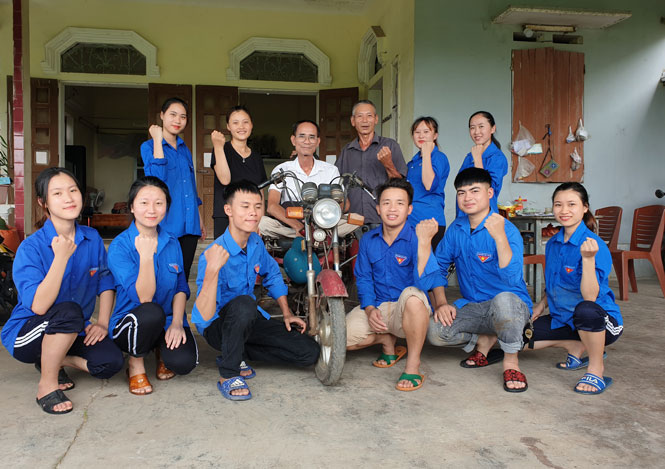 Nhóm sinh viên Câu lạc bộ Hạnh phúc trao tay chụp ảnh với ông Trần Thanh Long tại gia đình.