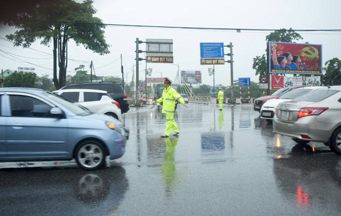 Lực lượng chức năng điều tiết giao thông tại khu vực cầu Gia Bảy.