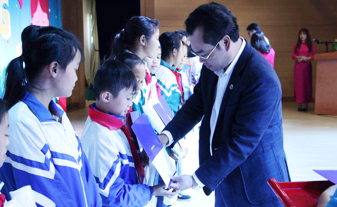 Đồng chí Trịnh Việt Hùng, Phó Bí thư Tỉnh ủy, Phó Chủ tịch Thường trực UBND tỉnh trao học bổng cho các học sinh nghèo vượt khó. Ảnh: T.L