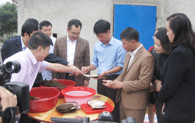 Đồng chí Trịnh Việt Hùng, Phó Bí thư Tỉnh ủy, Phó Chủ tịch Thường trực UBND tỉnh kiểm tra tiến độ thực hiện Dự án “Ứng dụng công nghệ xây dựng mô hình nuôi trai nước ngọt lấy ngọc” tại xã Tân Thái (Đại Từ). Ảnh: T.L